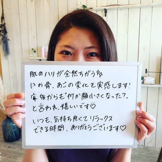いつもご来店ありがとうございます!来てくださる毎にフェイスラインのVラインがどんどんキレイになられて、お肌の透明感もすごいですね♡ 私もとても嬉しいです!!これからもRさんの若返りと癒しの場となれば幸いです!素敵なご感想ありがとうございました(^▽^)