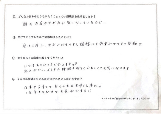 普通のエステではむくみが取れた、肌がキレイになったという効果しか得られませんでしたがこちらは骨格から変わるので、元に戻ってしまう心配がなく、通う度に理想に近づけているのでとても幸せです。