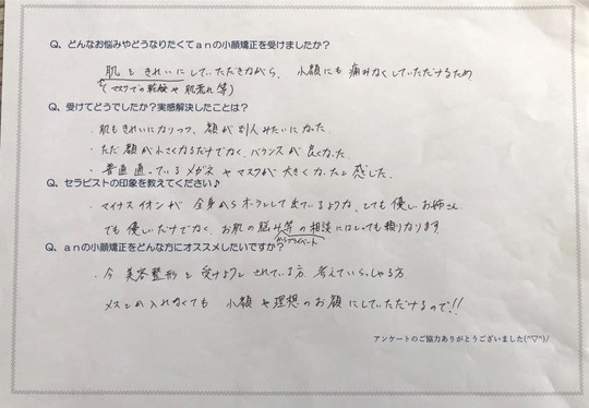 いつもご来店ありがとうございます!とっても可愛いM様♡初回からお顔の変化が凄かったですが、回を重ねて顔の下半分は削れたかのように二回り程小さくなられましたね。どんどん可愛さアップです♪これからもどんどん理想のお顔になるべく頑張ってまいりましょう! 素敵なご感想もありがとうございました。